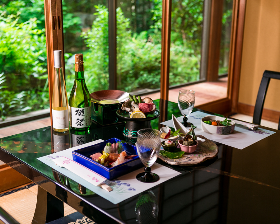 1~2階は落ち着いた和の風情に溢れる完全個室ゆえ、プライベートな時間を心置きなく会食で楽しめます。写真は板長特別コース例