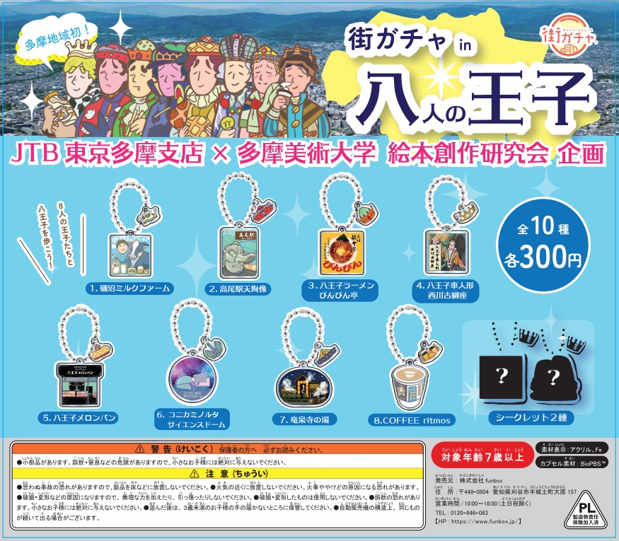 内容は、八王子の街をイメージする題材を取り上げたアクリル製キーホルダー全10種。うち2種はシークレットです。